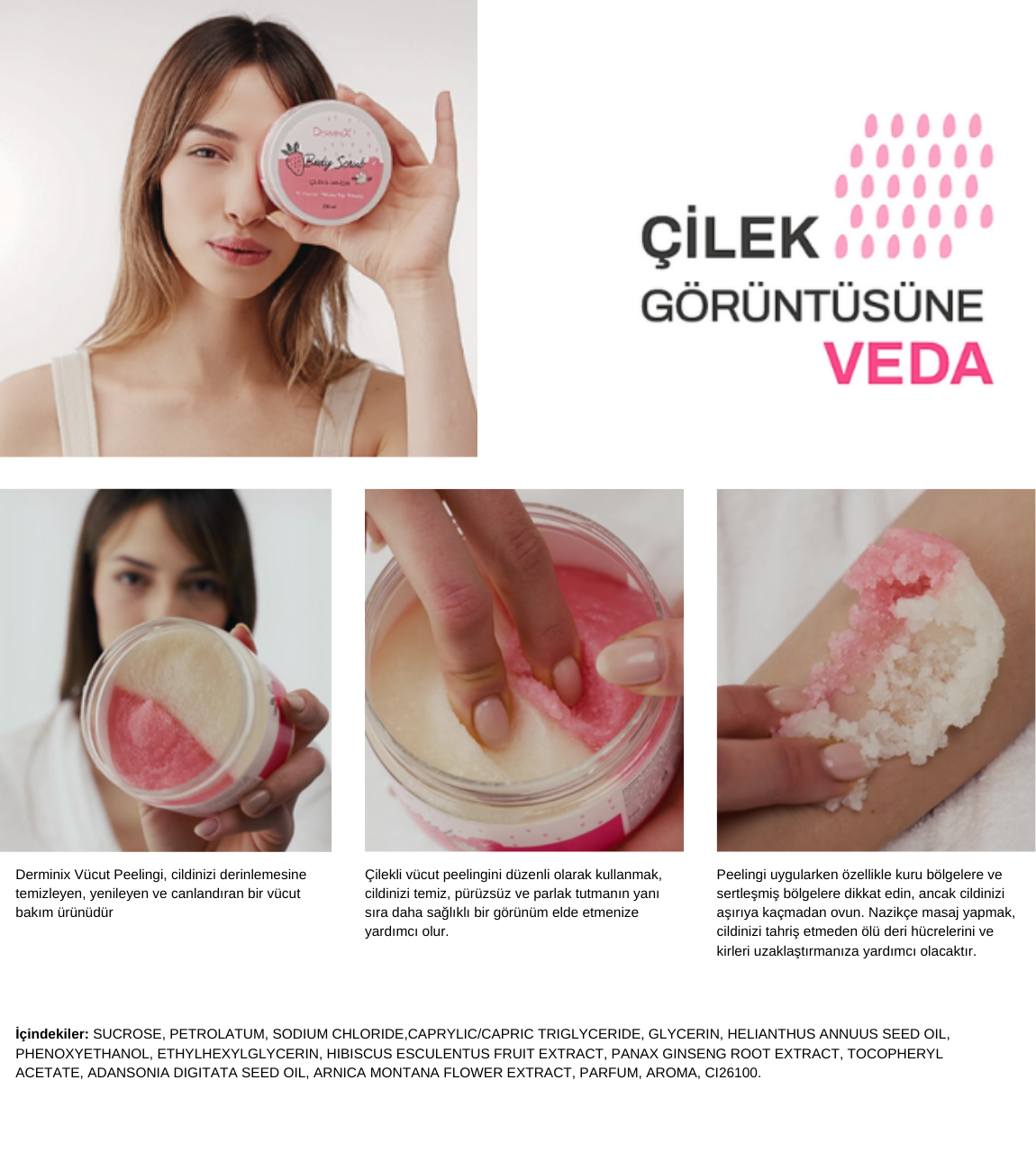 İçindekiler: SUCROSE, PETROLATUM, SODIUM CHLORIDE,CAPRYLIC/CAPRIC TRIGLYCERIDE, GLYCERIN, HELIANTHUS ANNUUS SEED OIL, PHENOXYETHANOL, ETHYLHEXYLGLYCERIN, HIBISCUS ESCULENTUS FRUIT EXTRACT, PANAX GINSENG ROOT EXTRACT, TOCOPHERYL ACETATE, ADANSONIA DIGITATA SEED OIL, ARNICA MONTANA FLOWER EXTRACT, PARFUM, AROMA, CI26100.